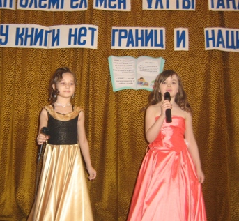 Выступление учениц нашей школы Болговой Юлии и Семыкиной Дианы в мероприятии "У книги нет границ"